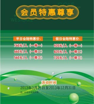 西湖高尔夫球会为感谢各位球友多年来对于球会的大力支持,自2013年3月15日起,会员携友来场打球,可享受会陪下场特惠价格!