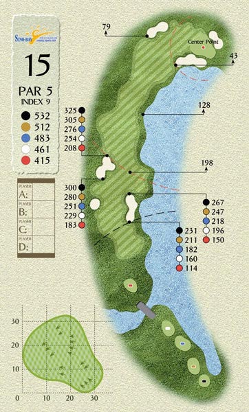 15号洞:487米/532码的五杆洞,这是上海地区占地最大的一个洞,气势磅礴而又充满诱惑,400米长,60-150米宽的湖面紧贴球道,时刻准备吞食右旋球。设计师安排了一个二杆上果岭打小鸟抓老鹰的机会勾引你,但这机会下面更多的是陷阱,不是单差点的选手慎重选此击球路线。此文章来源于网络, 版权归原作者所有。