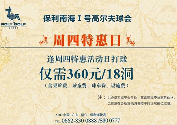 360元/18洞 广东保利南海I号高尔夫周四特惠日
