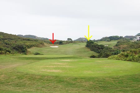 由于果岭左右两面都有沙池,而且是dogleg right的关系,所以攻果岭时要偏左面打,才可以打上果岭中间,如果错失了,就有机会跌进沙池里。