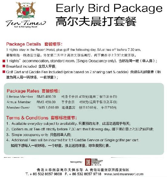 400元/人 青岛天泰温泉高尔夫球会晨打套餐