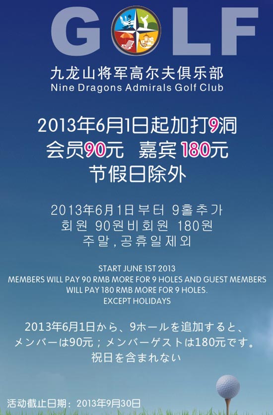 会员90元 浙江九龙山将军高尔夫加打9洞优惠
