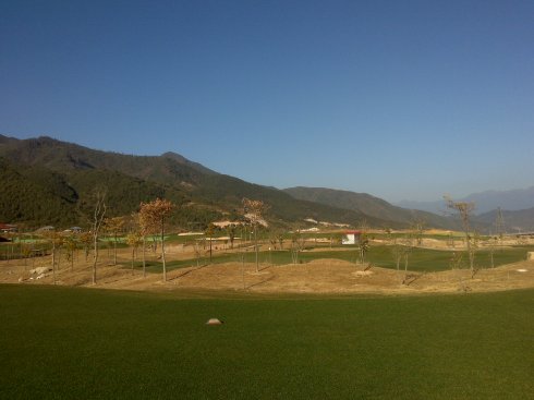 第三洞的落差更是大的让人称奇,348码的par4,估计打出280-290就能一杆上果岭,因为球飞出去后你眼看着半天不下来,但是落地却丝毫无法判断落点,这个球场的果岭很难,这样一个新球场能把果岭的速度调教到10左右是很不容易的,果岭上的草很密很整齐,看来球场的草坪部的水平绝非等闲。而且好多果岭的后方都是沟壑,打过了就是万劫不复。连续打了三个洞的高往低的落差,也该来点压力了,果然第五洞的par5,一路上坡,我第一杆开的很好,距离果岭还有210码,平时这个距离4号铁是轻松可以打到的,今天这个四号铁打的相当扎实,清脆有力的直奔旗杆,我当时想两上没问题了,结果到了跟前发现还距离果岭近15码,从下往上打的落差同样难以判断,而且果岭起伏巨大,,今天旗杆插在一个拱坡的上面,我竟然在这里搞了一个五推,因为第一推没上斜坡,球竟然滚回脚下,第二推又没上去,又回到脚下。。。。郁闷。。。