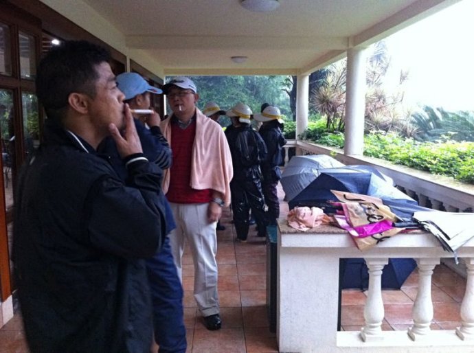 在小卖店等了10分钟左右,不见雨有丝毫的减小,反而愈加猛烈,所有客人看这情况,只好收拾好东西,准备回会所,我们的客人也起身一起走,刚才热闹的小亭子一下子陆陆续续都打道回府了!回来之后我的客人还问我有没有拿到小费啊?我实在不好意思要,毕竟我什么都没有做,仅仅只是开了九个洞的车,陪着淋了场雨,拿敢要小费,我说不用了,不用了,可另外一台车的客人早早的就把四个球童的小费给到他们球童手上了,哎!怪不好意思的!与客人道了别之后我们就下去收拾球具了!还分了一份小费,嘻嘻~!