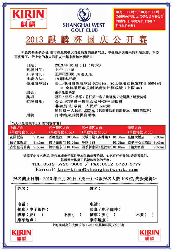 报名:上海光明高尔夫2013麒麟杯国庆公开赛