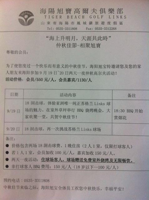 烟台海阳旭宝高尔夫俱乐部贺中秋两天**送烧烤活动,会员:550元/人,嘉宾1130元/人;价格包括两场18洞击球费、两人一间住房、住房打球客人赠送免费烧烤及无限畅饮。 日期2013年9月19日至20日,欢迎大家报名。