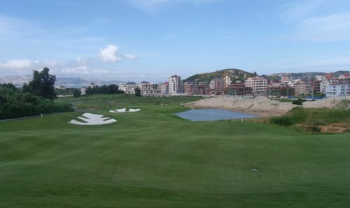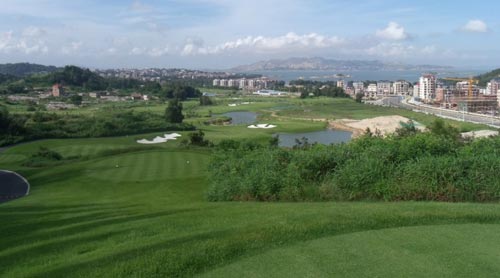 打完2场,个人对妈祖球会14号球道非常喜欢,这是一个落差比较明显的短4杆有狗腿洞,风景非常漂亮,可以远眺大海,又可以俯视诸多球道。蓝梯到果岭的直线距离估计在260码左右,蓝梯到最保守的球道落点区大约150码,这个就给所有球友都提供了丰富的选择。