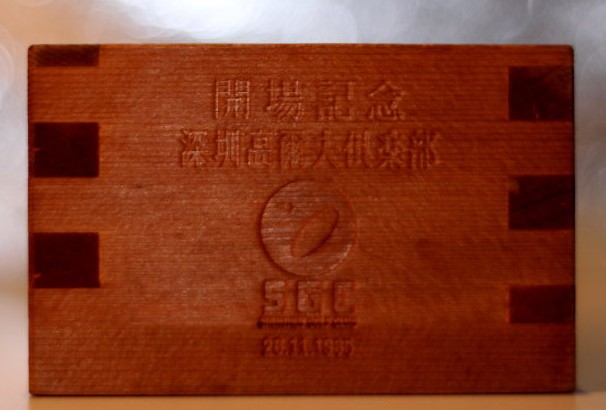 有一个木制的日本酒杯最为特别,上面清楚地记载着深圳第一家球会深圳高尔夫球俱乐部的开业时间 - 1985/11/26。