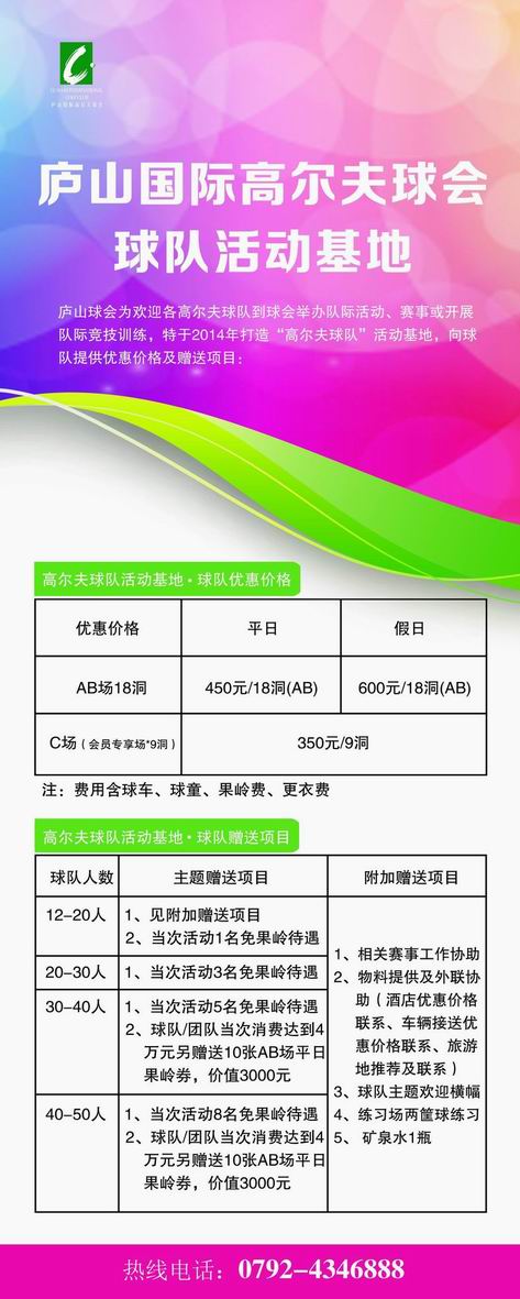 注:享受以上球队优惠价格需提供球队LOGO、球队名称及每一位队员的姓名及联系方式,球队人数不含已享受联盟球场会员待遇人数;赠送之果岭券需于下次到场时方可使用!