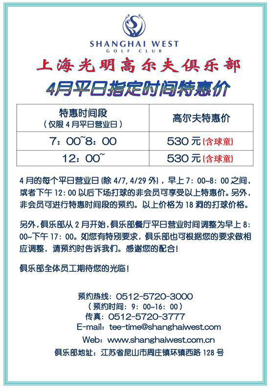 530元/18洞 上海光明高尔夫4月指定时间特惠