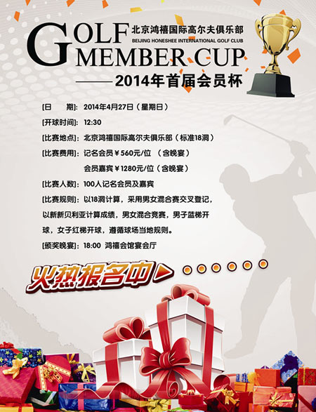4月27日,鸿禧国际高尔夫俱乐部2014首届春季会员杯即将隆重启幕!感谢您多年来对我们的支持与厚爱,此次活动有丰厚大奖呈现给您,欢迎您的莅临!