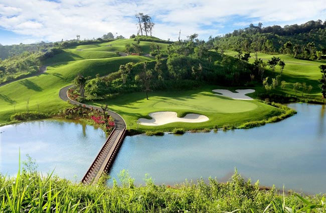 球场的4个5杆洞都不容易,其中蓝tee626码的12号洞更是全场难度第1,也是球场最有特色的球洞。这是整个球场起伏最小的球洞,天气晴好时甚至能从发球台直接看到果岭,一片水域将球场的球道分为左右两部分,球手在这里有两个选择:可以第一杆打出220码以上过水,将球打上左边球道,第二杆再打一记200码甚至250码以上的长杆抄近路过水攻果岭,但这容不得任何闪失。保守的选择则是沿右边球道进攻,但这也不容易,需要三杆打足600码,而且并不宽阔的球道左边是水,右边是一旦陷入只能束手无策的陡峭山坡。
