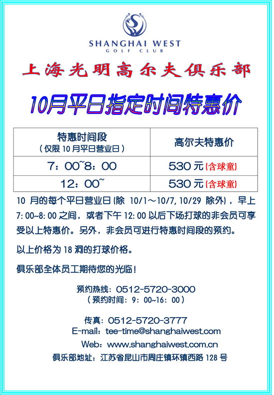 530元/18洞 上海光明高尔夫10月平日指定时间特惠