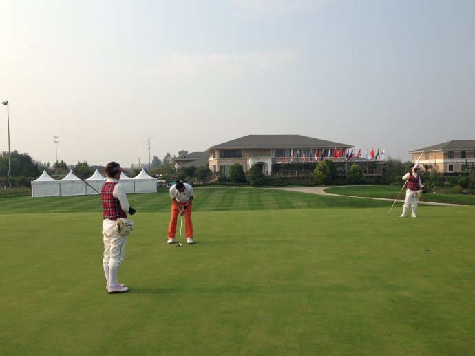 和我同组的两位球手都是职业球员,一个是来自英国的,一个是来自郑州本地球会的。在一丝丝晨雾中开球了,我们从十号洞开球是个五杆洞,我中规中矩三上打帕,另外两位好像没有进入状态,虽然早上但是果岭的速度在10以上不还对付。打完六个洞的时候我有两个破击其中还包括一次下水,马职业问我是哪儿的?我回答西安的,他接着说那个球会啊?我忽然明白了可能是当我职业教练了,我连忙摆手俺只是来看比赛的我是个业余球迷。因为六洞过后+2还领先着呢,第七洞是个五杆洞,第三杆将球放到一支旗杆的距离,只是斜坡往下,这是我突然盘算着:这个鸟推进的话7个洞加了一杆,哈哈。。。可有牛逼吹了!但是天有不测风云,一不留神敲球了,过洞后停不住这一洞从鸟推成了鸡!紧接着是个481码的长四杆洞,一号木得有距离,手上发力有点儿左曲进了红桩,抛球后铁杆想过渡一下,没成想选杆没注意右边的水湾,得又进去了。。。本洞加3。接着456码的四杆洞一号木左直下水,这洞又吃了+2,三个洞加了6杆,前九44收工。