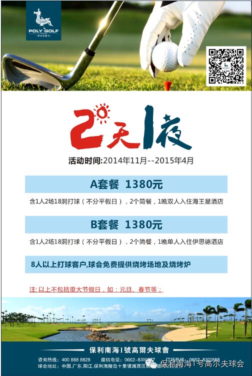 保利南海I号高尔夫球会现推出2天1夜打球套餐,两场球加住一晚,8人以上打球客户还可以享受球会免费提供的烧烤场地及烧烤炉,让客户打完球,还能面朝大海来一个篝火派对。