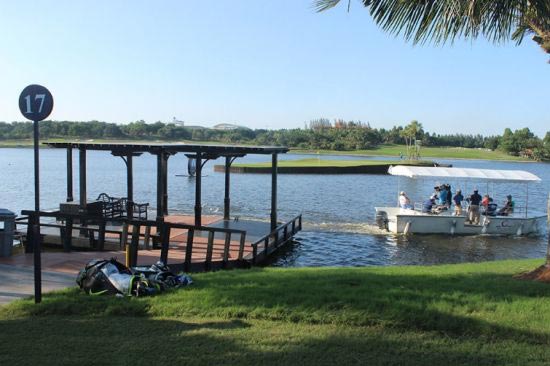 由于四面环水,球员们开球之后,要先走到果岭附近的岸边,乘船从岸边到水中央的孤岛果岭上。在17洞的果岭边,有一条船专门负责摆渡打球的球员和球童,送到果岭边后会等球员们完成这一洞,再将他们摆渡回岸边。