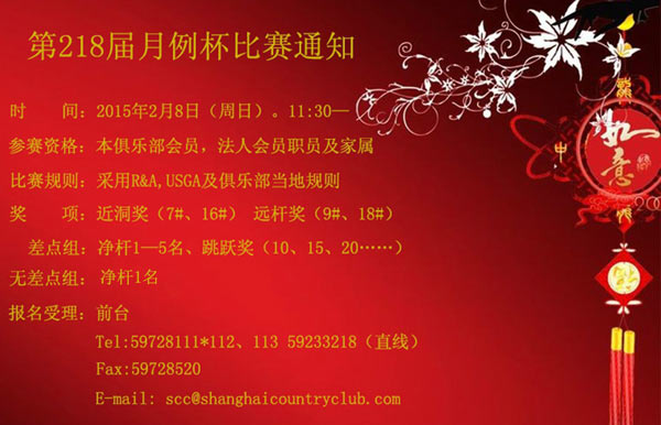 春节前的最后一届月例杯将于8日隆重举行,期待各位踊跃报名。