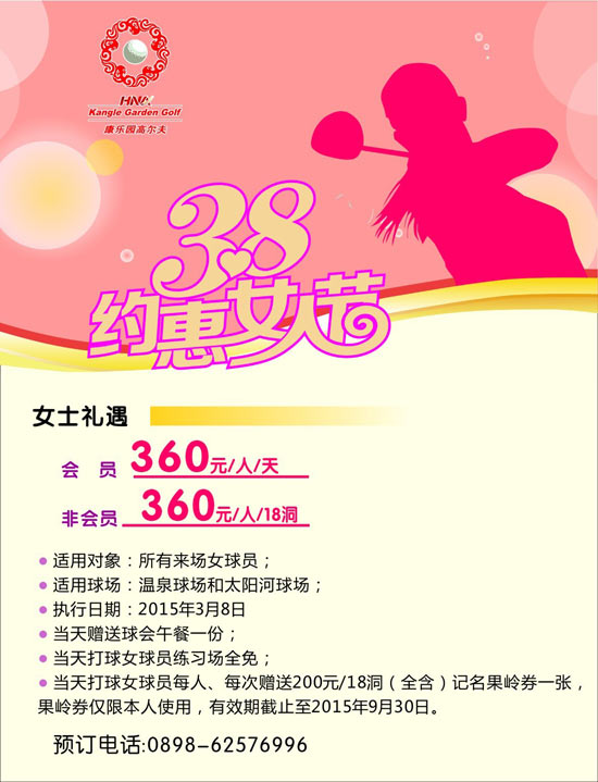 360元/天 海南兴隆康乐园高尔夫球会"38"节优惠