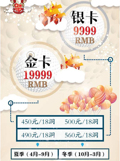 购买银卡9999元或金卡19999元即可享受打球优惠价,购卡费用当打球费使用,费用从卡中扣除,此待遇有效期一年,3月-9月购卡还可再延续1个月有效期,打球费用满200元即送100元打球代金券。