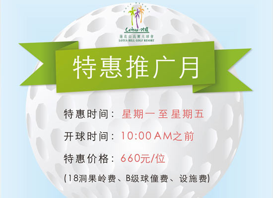 推广内容:每周一至周五,早上10:00前下场的非会员球手,均可享受¥660元/位(含18洞果岭费、B级球僮费、设施费)的特惠价格。