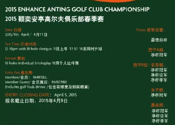 2015年颖奕安亭高尔俱乐部会员春季赛将于4月11日(周六)12:30开球。现火热报名中,欢迎您的参加!