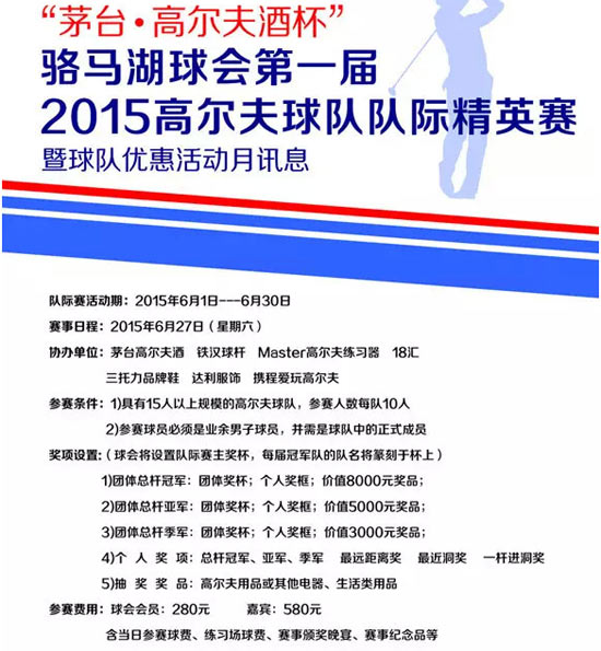 “茅台·高尔夫酒杯”骆马湖球会第一届2015高尔夫球队队际精英赛将于2015年6月27日在骆马湖乡村俱乐部举行。