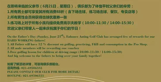 爸,您辛苦了! 6月21日父亲节当天,颖奕安亭高尔夫为辛勤的爸爸们准备了丰厚的优惠活动。