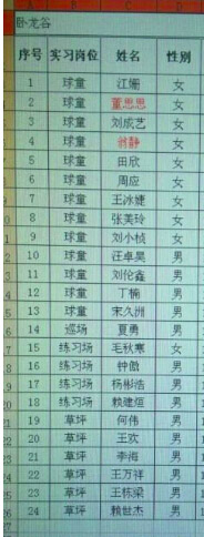 芳菲四月,我投了三份简历,最终还是被四川卧龙谷高尔夫俱乐部录取,让我难过的是没有被球童部录取。 但是被巡场部录取了我也感到很庆幸, 因为我是唯一的一个巡场员! 欧耶! 下面是我们这群新人的名单和岗位分配: