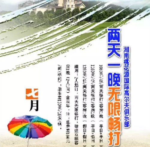 在这个激 情夏日,清爽一夏,湖南桃花源国际高尔夫俱乐部七月一日隆情推出“2天1晚【无限畅打】,桃花源高尔夫优惠任我行套餐”