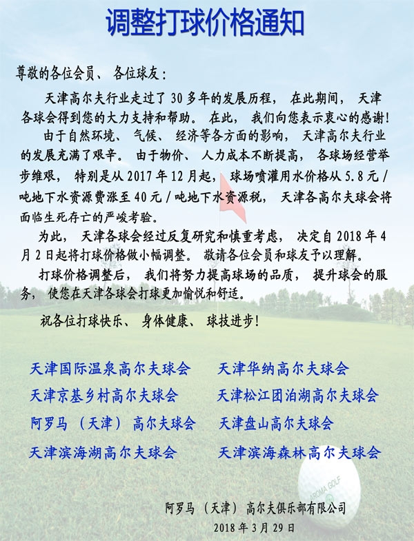 天津阿罗马高尔夫球会调整打球价格信息