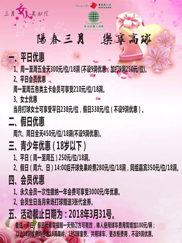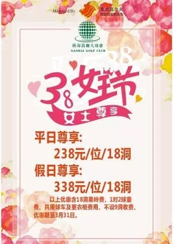 佛山南海高尔夫三月女士优惠 238元/18洞