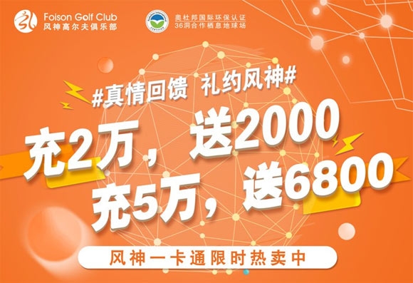 风神高尔夫一卡通限时热卖,10月1日开抢啦! 充2万送2千,充5万送6800,更有价值1580围宴、练习场月卡等豪礼赠送。本卡不记名使用,可用于个人在风神各营业点的消…