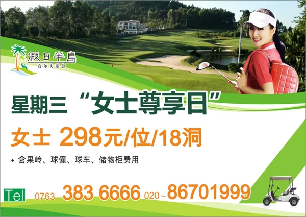 假日半岛高尔夫球会逢周三女士尊享298元/18洞/位(费用含果岭、球童、球车、储物柜费)!