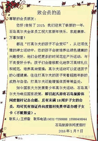 威海石岛高尔夫会员可免费申请办理子女卡