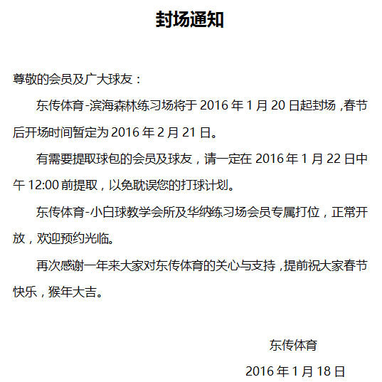 天津滨海森林高尔夫练习场1月20日封场通知