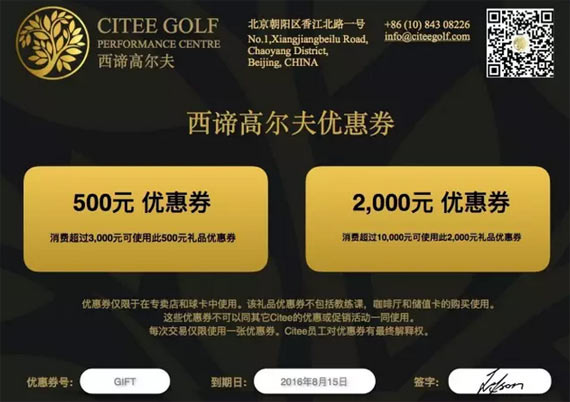 西谛高尔夫及其团队为您和您的家人提供西谛夏季优惠券。此优惠券可用于专卖店和球卡,截止日期至2016年8月15日。我们期待您的光临。 电话:010-84308226 地址:北京朝阳区香江北路1号