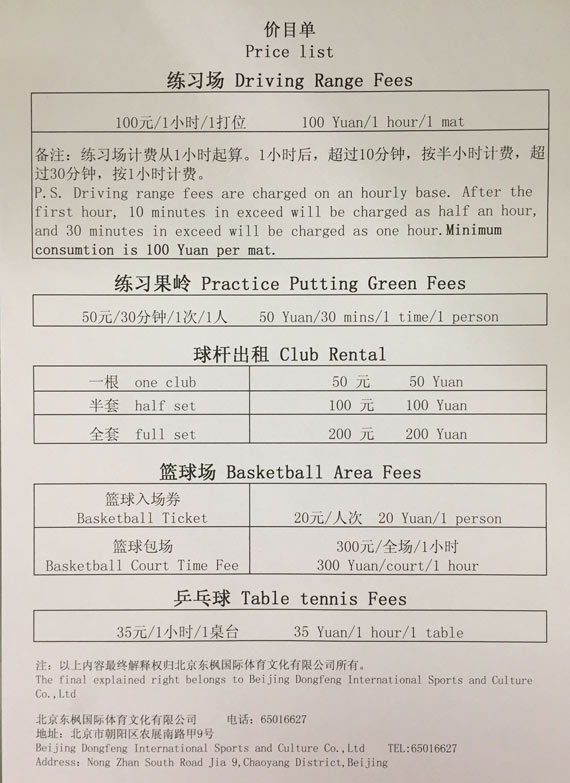 北京东枫国际体育园高尔夫练习场价目表