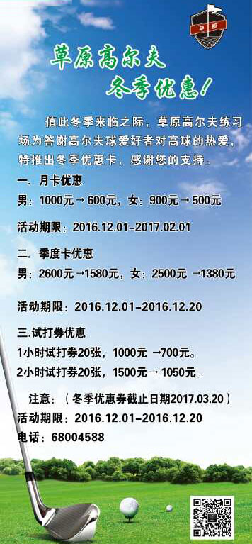 500元/月 青岛草原高尔夫练习场冬季优惠活动