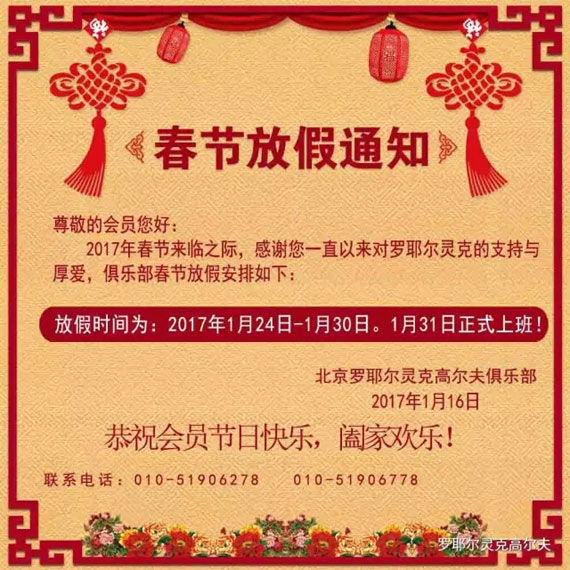 北京罗耶尔灵克高尔夫2017年春节放假通知