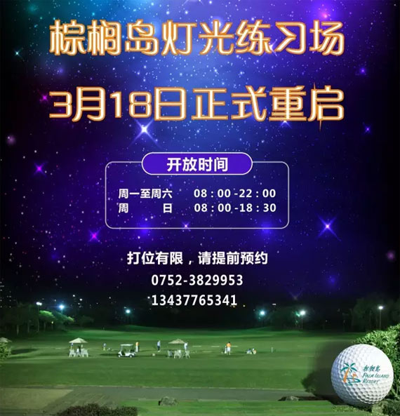 广东惠州棕榈岛高尔夫练习场3月18日开启夜间灯光