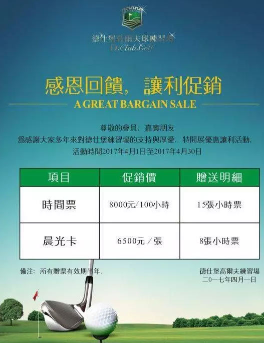 为感谢各位会员及嘉宾朋友多年来对德仕堡健康运动中心·高尔夫练习场的支持与厚爱,本练习场从4月1日起特开展为期1个月的优惠回馈活动,活动详情见下表: