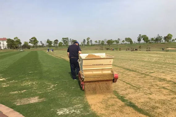 练习场果岭使用一段时间后,由于频繁的活动和自然逆境等因素会使草坪的根系外露,地面凹凸不平等现象发生,为了不影响击球,维护草坪的正常生长和发育就需要进行垂切及铺沙等作业。在草坪生长季节,铺沙不但可以促进草坪分蘖生根及促进其新陈代谢,而且可以增加草坪平整度和生长速度。