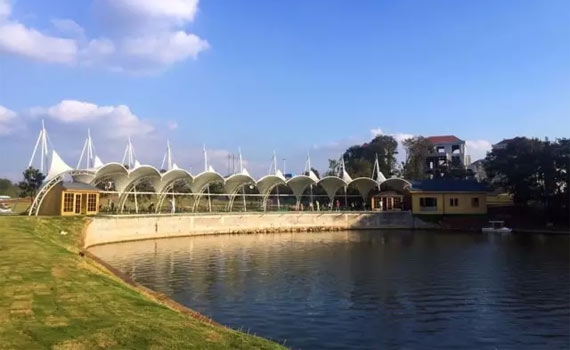 水上部分以400亩仙女湖大湖水面作为挥杆练习场,陆地部分为面积约10000㎡的绿荫果岭。