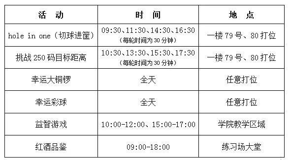 全天开放趣味活动——“切球进筐(hole in one)、挑战250码目标距离、幸运大铜锣、幸运彩球”等项目多多,欢乐多多,更有丰富礼品,让您全天乐不停!