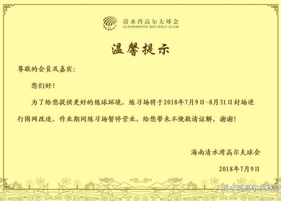海南清水湾高尔夫练习场暂停营业,改造通知