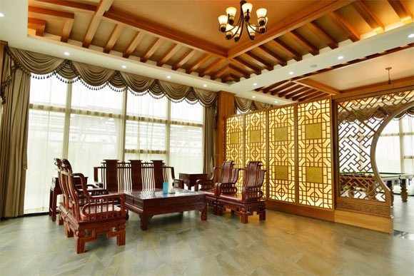 高尔夫休闲会馆总建筑面积308平方米,内设两处休息区和一处休闲娱乐区,高贵典雅的装修风格,搭配古色古香的实木家具,让游客在温馨环境中,尽享尊贵舒适。