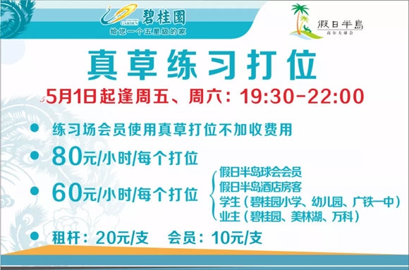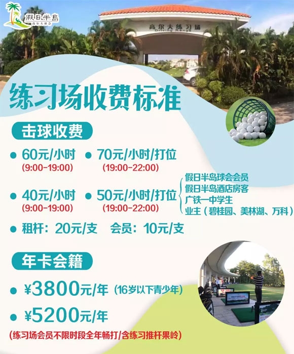 2、假日半岛会员、假日半岛酒店房客、广铁一中学生、碧桂园小学、幼儿园、业主(碧桂园、美林湖、万科):50元/小时/每个打位;