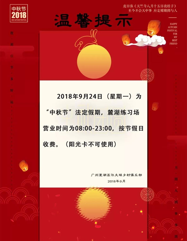 广州麓湖高尔夫练习场“中秋节”假期营业时间