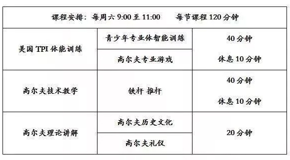 高尔夫课程内容包括美国TPI体能训练,青少年专业体智能训练,青少年专业游戏,高尔夫历史文化教学,高尔夫技术讲解,高尔夫礼仪教学,高尔夫规则教
