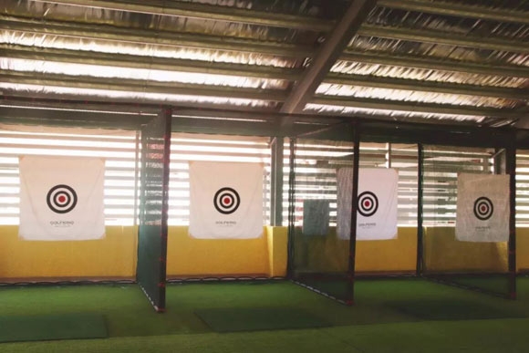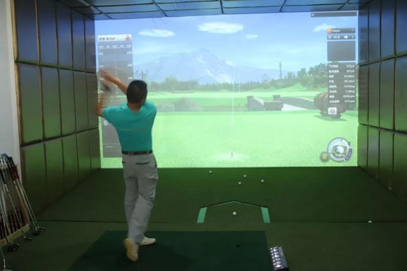 走进高尔夫球馆,一条蜿蜒的高尔夫练习场地映入眼帘,场馆内分为高尔夫模拟器击球区、练习区和休息区,碧绿色的的场地令人心旷神怡,顿时感觉充满力量。选手可使用球杆击打球,通过投影机投影展现的模拟场景,挥动手中的杆子进行真实的高尔夫练习。